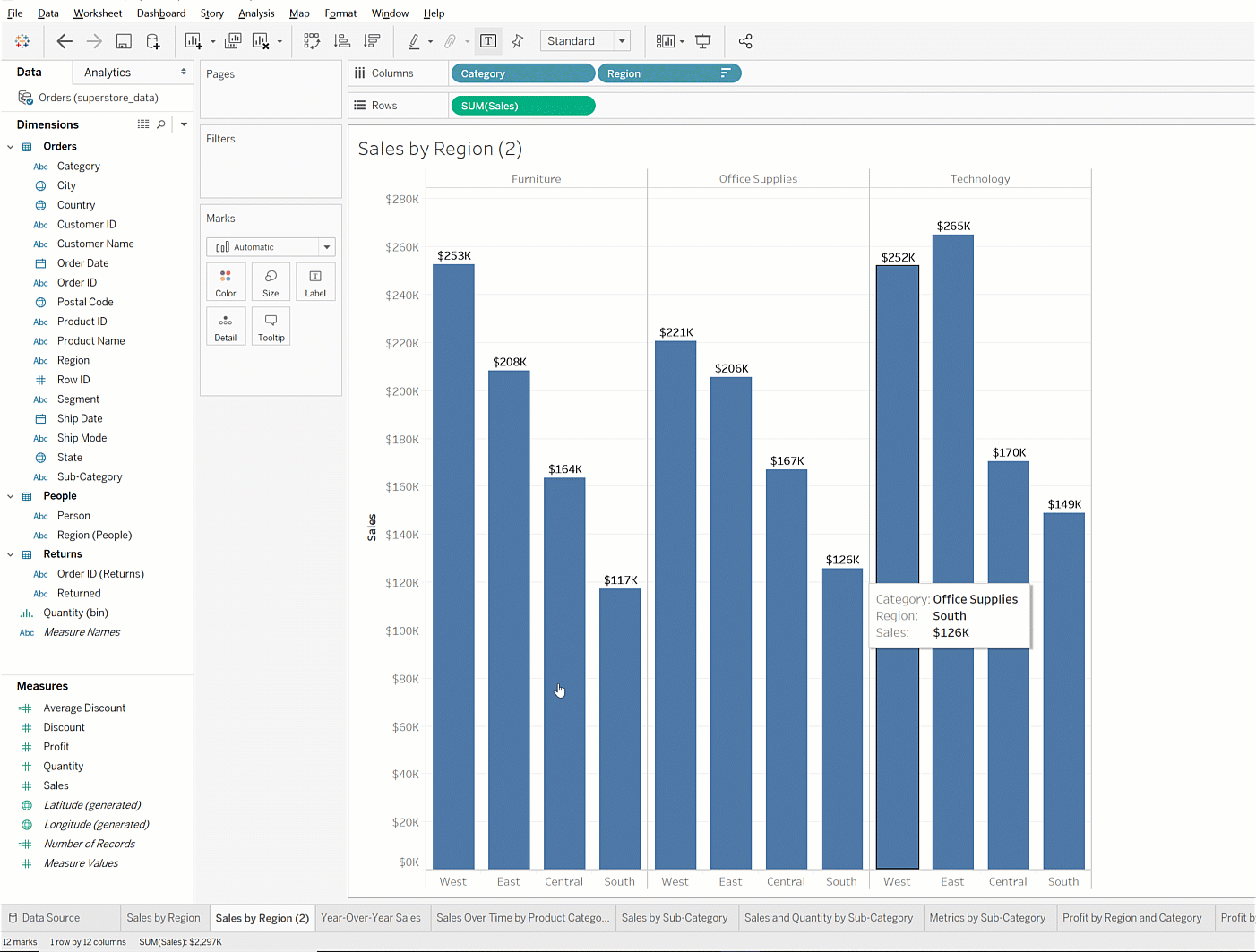 Alternatively, you can drag Category to the left of Region, which reverses the order. This will allow you to compare regions to one another within a certain category, like this: