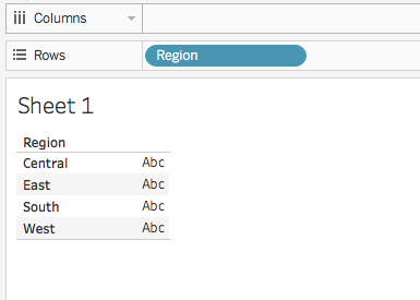 Tableau groups unique values in the variable Region into columns. Now, try dragging Region into the Rows shelf. You will see the image below: