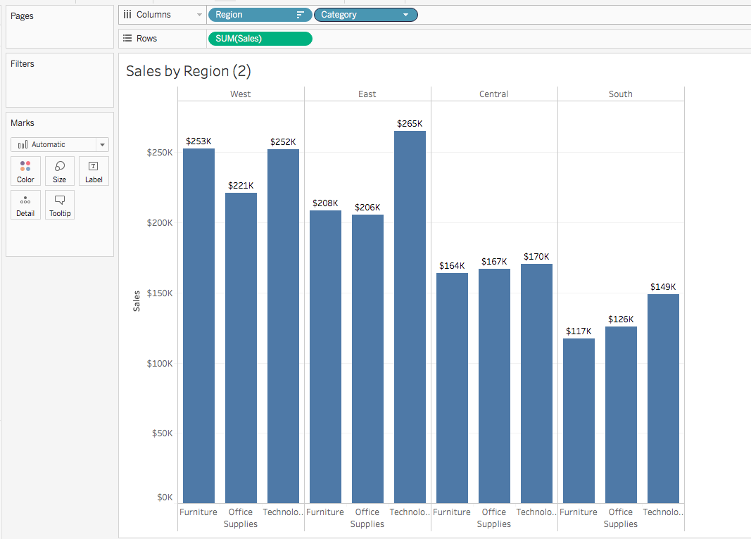 To change the chart to a side-by-side chart, move Category from the Marks card. Drag it to the Columns shelf, to the right of Region. You can now easily compare how each category is doing for each region, as shown below: