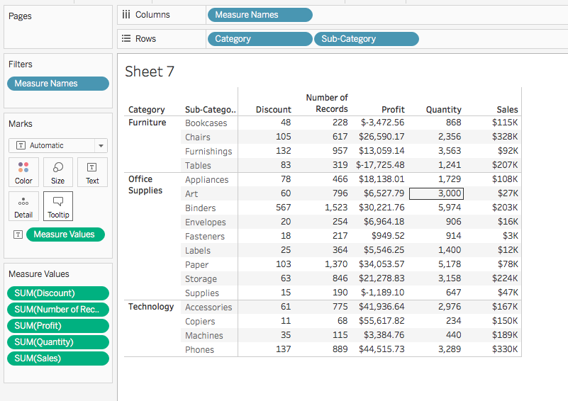 You'll see that Measure Values captures every measure available that is unhidden in the measures section. If you didnβt want to include a certain measure, you could drag it off the Measure Values shelf. Rename your worksheet Metrics by Subcategory and save your work before moving on.