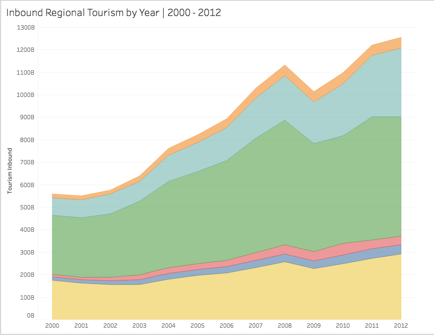 Create an area chart that displays inbound tourism for each region for each year in the dataset. Your chart should look like the one below, though the colors might differ: