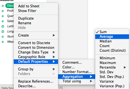 Go ahead and rename this worksheet Average Discount by Region and then save. The approach you just took alters the aggregation mechanism for this measure in this specific worksheet and chart. Note that it's also possible to change the default aggregation for the measure for any worksheet or chart it's used in. This can be done by right-clicking the Discount field in the Data pane under Measures and selecting Default Properties > Aggregation > Average. Go ahead and change the default aggregation method to average for Discount.