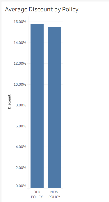 When you've created this calculated field, you can create a new visualization by dragging Discount Policy to the Columns shelf and Discount to the Rows shelf. With a bit of sorting and number formatting, you can get the chart below. This reveals that average discounts went down slightly after the new policy was enacted.