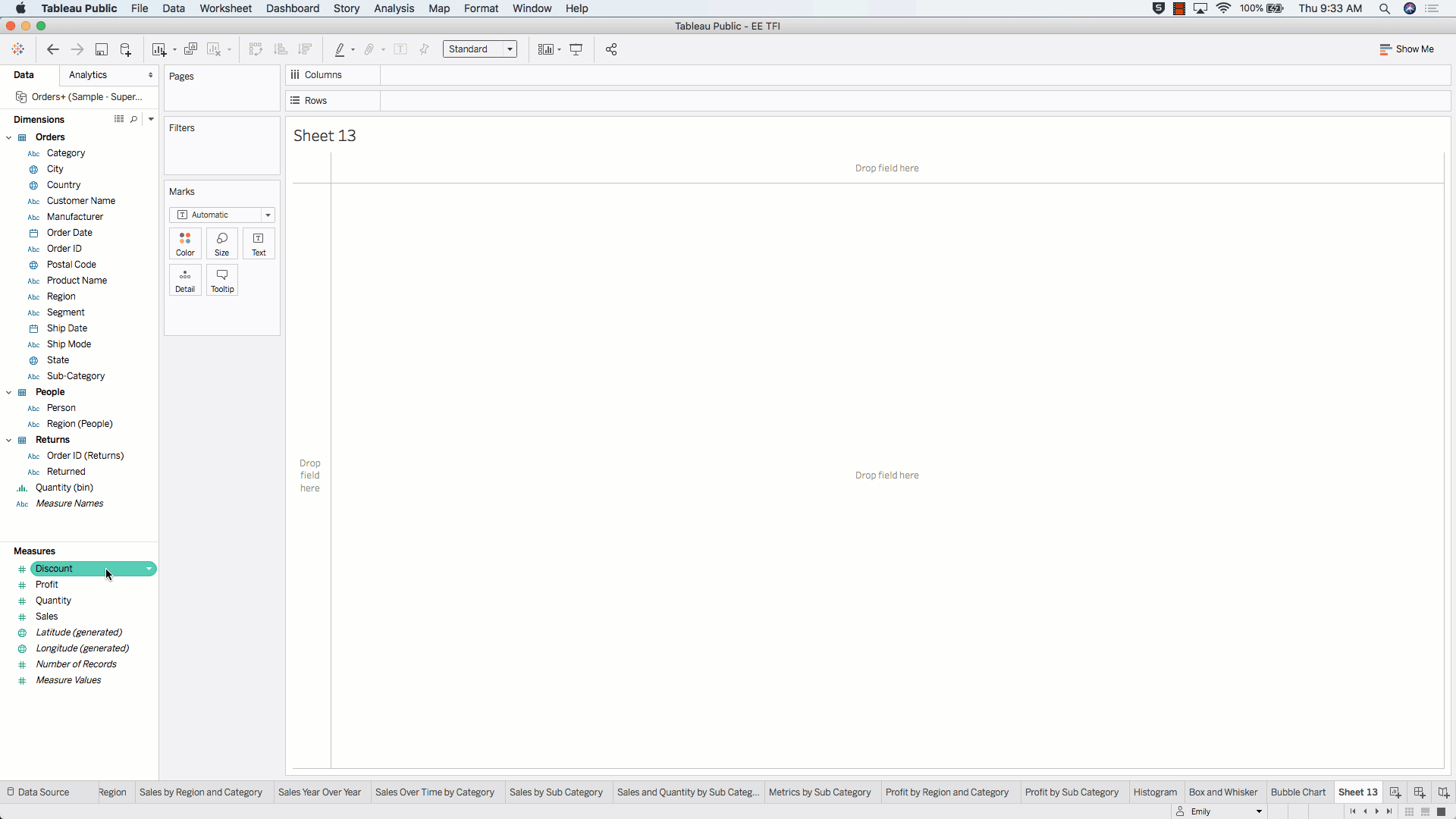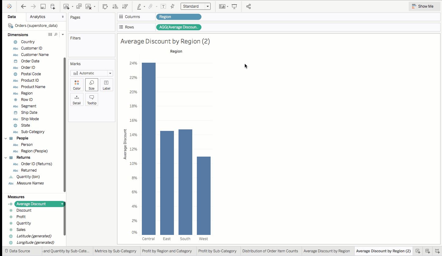 Next, try out your calculated field by recreating the Average Discount by Region worksheet you made earlier. This will prove that the calculated field gets the same result. Name this worksheet Average Discount by Region (2).