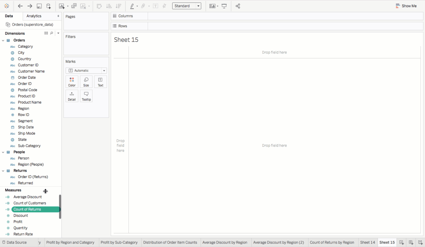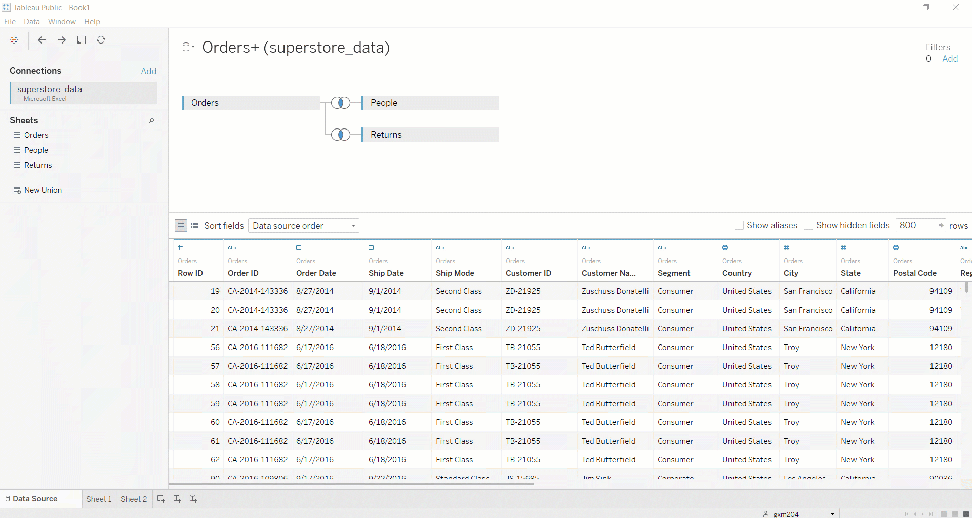 If you're starting this workbook from scratch, make sure the workbook looks like results below. If it doesn't, head back to the Data Source sheet of the workbook and double-check the joins. You want the left outer joins to connect Orders to People and Orders to Returns. Tableau makes these be inner joins by default. This means you'll get only records with a returned item in the Order ID. To change this, click inside the two Venn diagrams, and change the join types from Inner to Left: