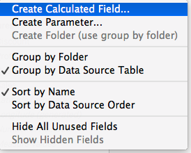 First, right-click on the bottom of the Dimensions area or on any white space in the Measures area. Then, select Create Calculated Field. You can also click on the drop-down triangle next to Dimensions, or select Analysis from the home menu to find the same option: