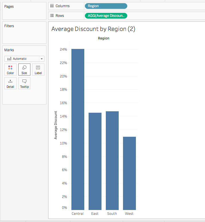Create a new worksheet. Then, drag Region to the Columns shelf and Discount to the Rows shelf. You should see something like the following chart: