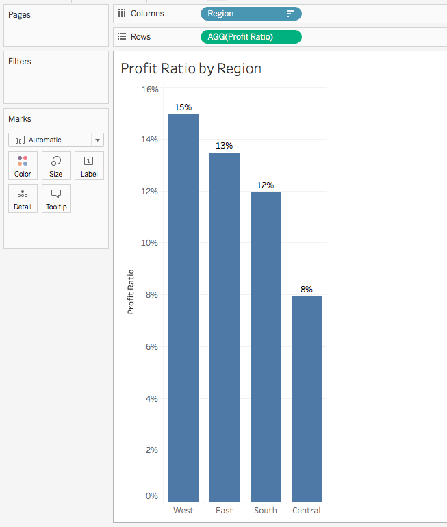 You could use this metric to get a comparative view of profit ratio by region. First, you'd want to update the number formatting for this measure to percentage. Then, you'd drag Region to the Columns shelf and Profit Ratio to the Rows shelf. Finally, sort regions in descending order by profit ratio.