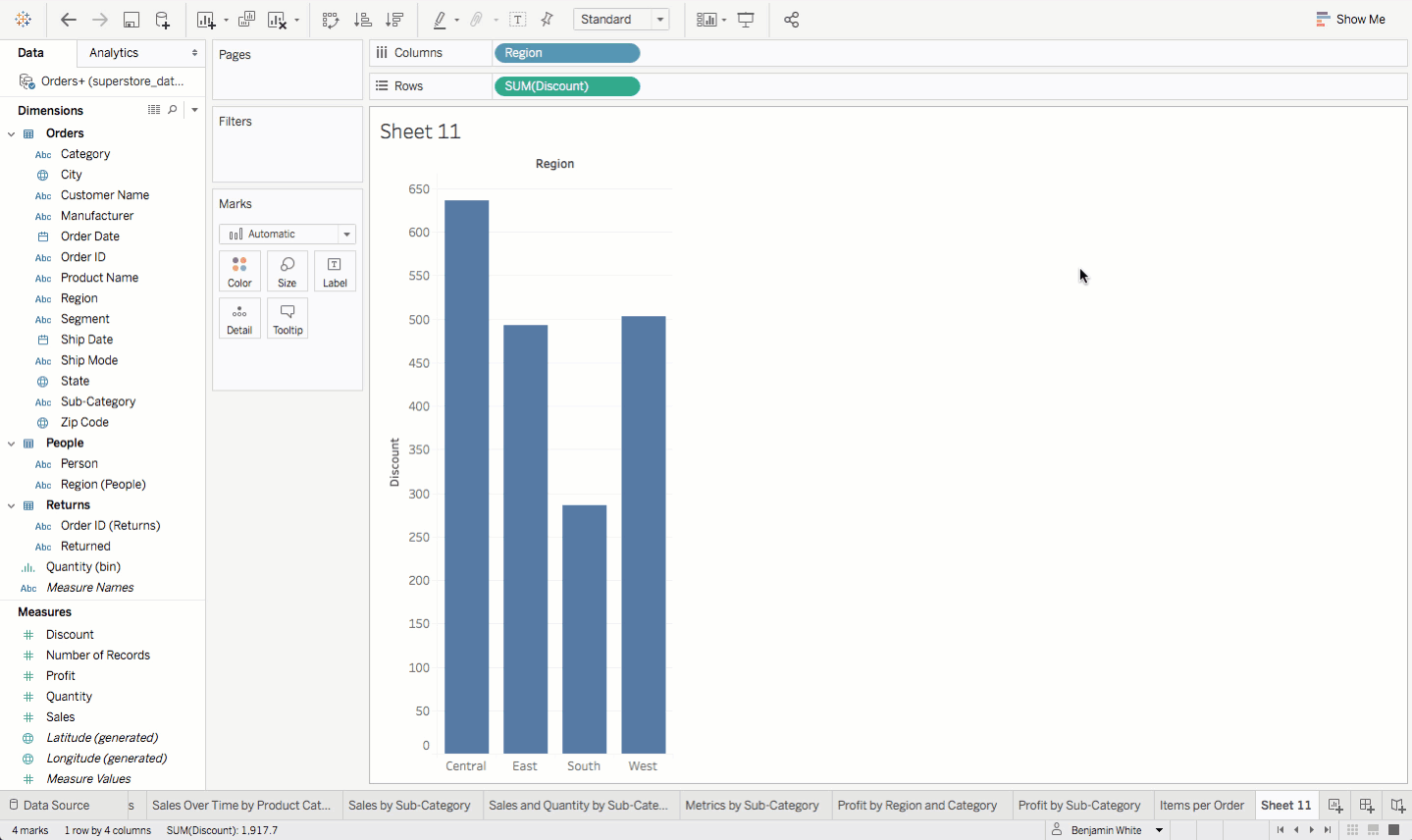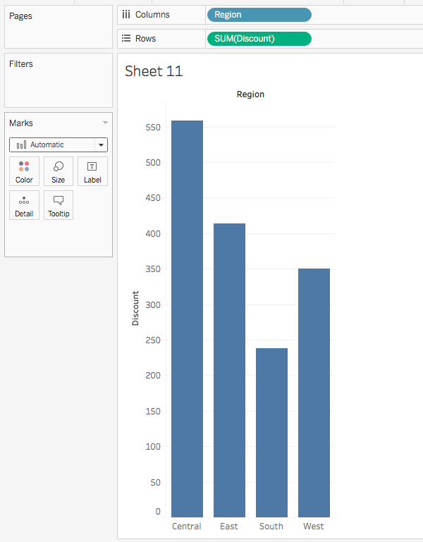 You can see that the Central region has what appears to be the highest discount amount: a little more than 550. You can also see that these values are being aggregated by sum by default. Notice how Tableau displays SUM(Discount) in the Rows shelf.