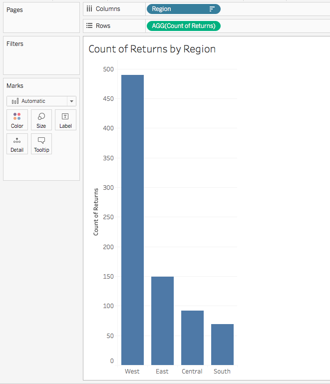 Now, you can use this calculated field to generate a bar chart depicting the raw number of returns by region. It might look something like the chart below:
