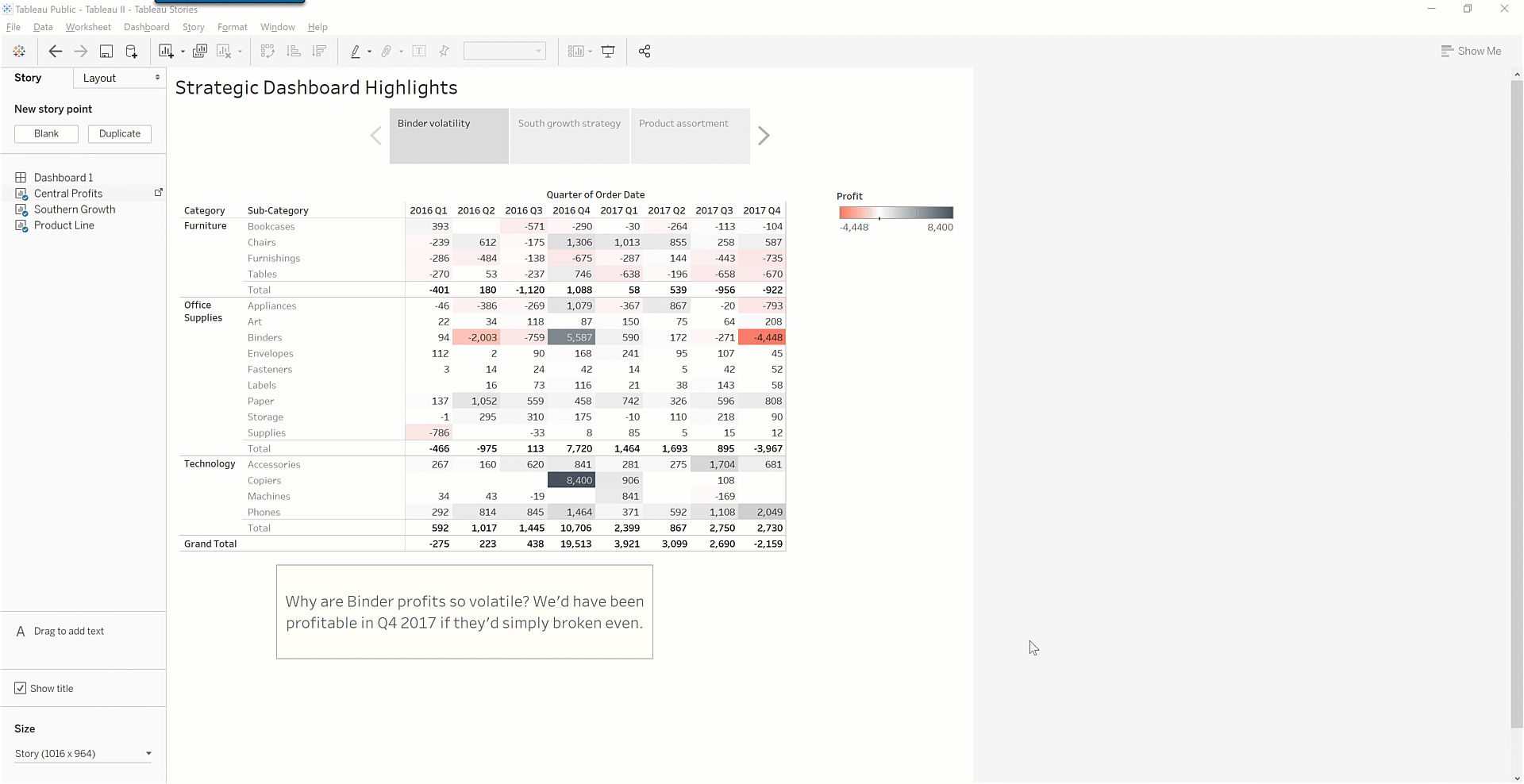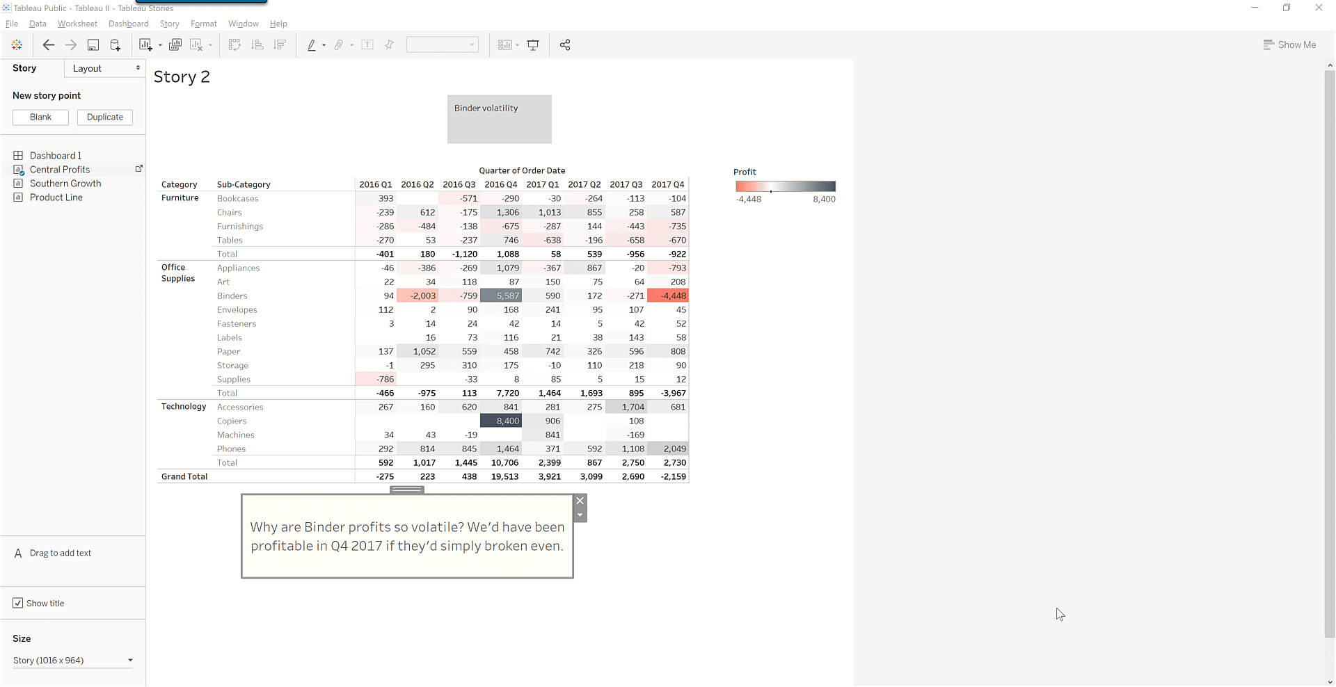 Here, you can see that binder profit is extremely volatile. In the most recent quarter, the loss was enough to drive the entire Central region into the red. Is there anything the company can do to end this volatility? You can make a story out of it to find out!