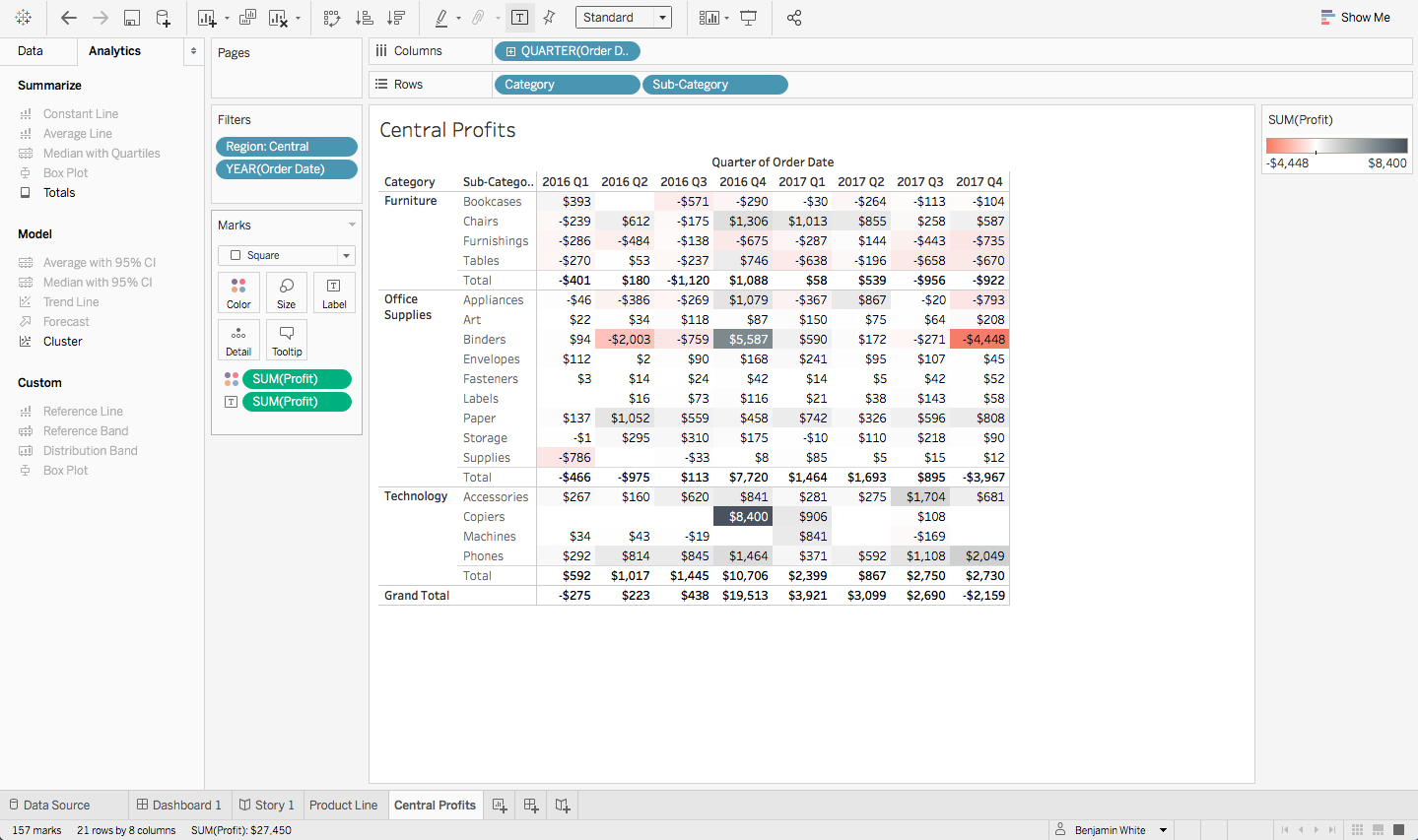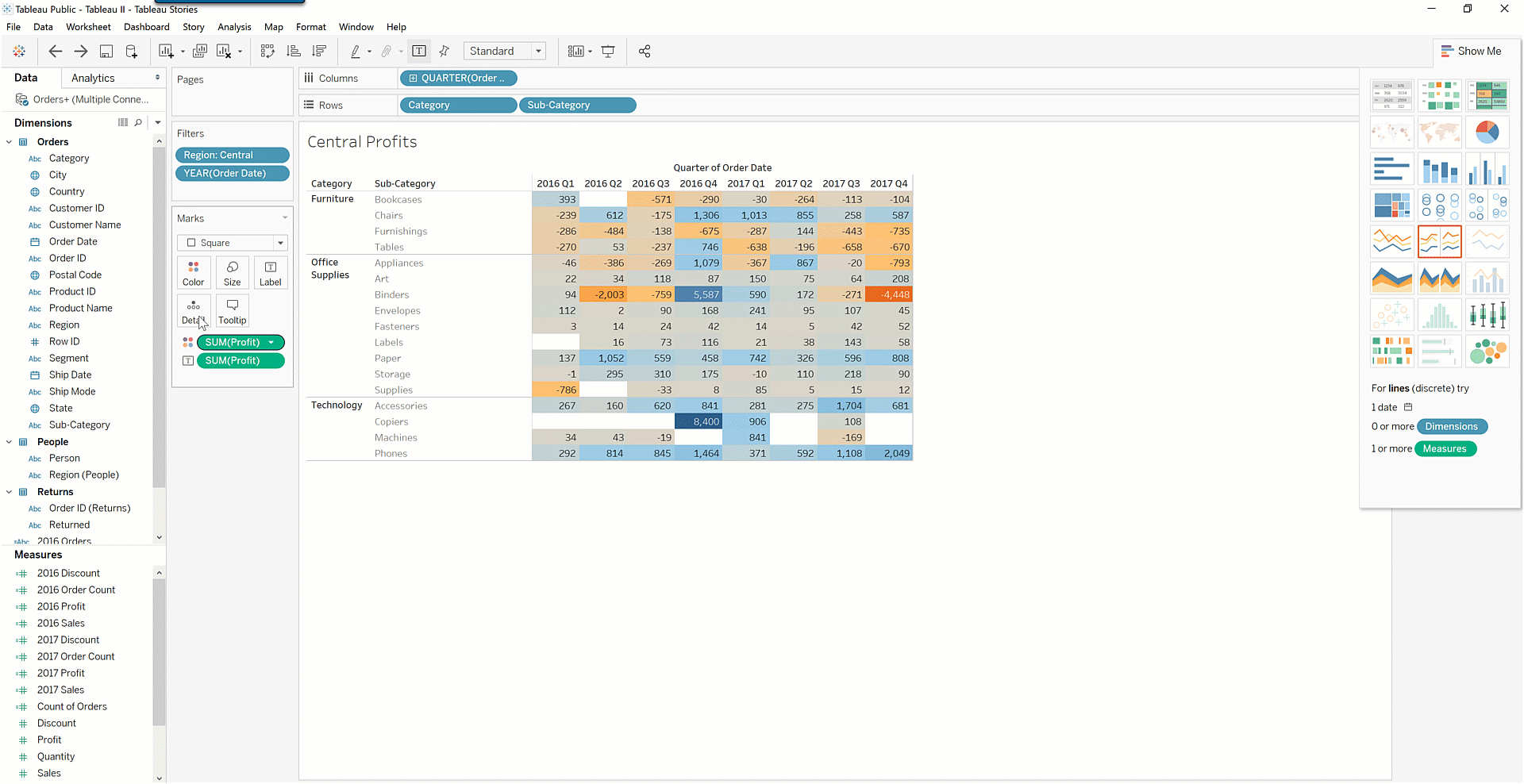 In the case of this question, you want to drill down precisely into the data. To identify exactly where the losses are coming from, use a heat map (which you learned about in a previous checkpoint). Use the filter to get just orders from 2016 and 2017 in the Central region.