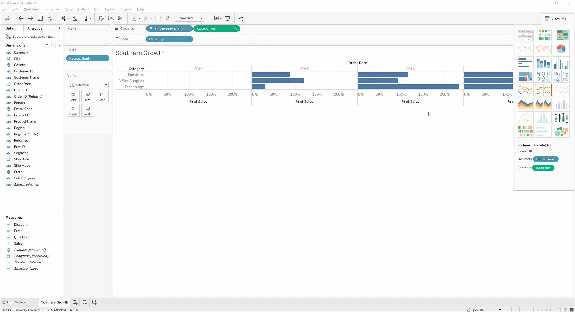Tableau makes it quite easy to look at both whole numbers and percent differences. Using a panel of bar charts, examine how sales for each category are growing year over year.