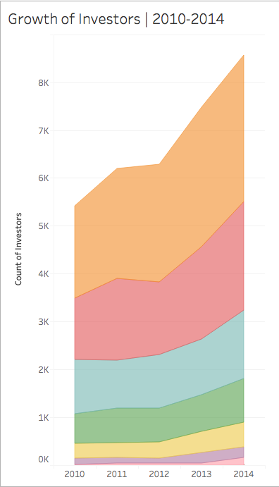 5. Create an area chart that shows the growth of the total number of unique investors between the years 2010 and 2014. This chart should be color coded to depict the funding round of the investments. But it should exclude instances in which the *Funding Round Code* value is null. Check your result against this sample answer: