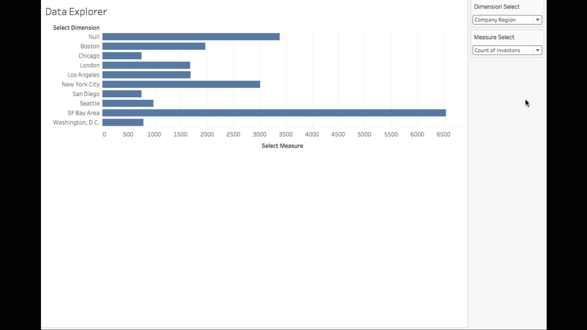 7. Create a horizontal bar chart that enables exploratory data analysis. Make a selectable drop-down menu that lets the user choose between three specific dimensions, which should form the rows for the chart, from the *Companies* subset of the dimensions data. The three dimensions should be *Region*, *Market*, and *Category List*. 8. There should be a second selectable drop-down menu that lets users choose between the following three measuresβ*Raised Amount*, *Count of Companies*, and *Count of Investors*. Those should form the columns for the chart. (Note that the last two measures should have been created in an earlier task in this assignment.) 9. For whichever combination of parameters the user selects, the chart should display only the top ten items. The chart should look and behave like the one below. (Note that this animated GIF demonstrates the drop-down menu behavior, too.)