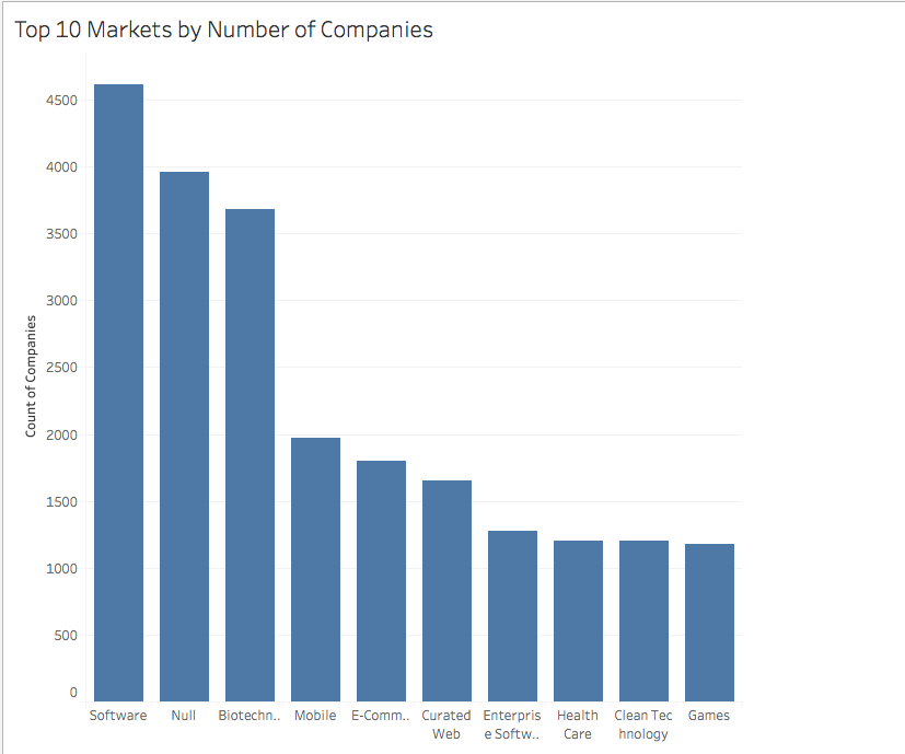 Create a visualization called Top 10 Markets by Number of Companies. It should be a vertical bar chart that looks like the one below. Hint: you'll need to create a calculated field that generates a count of unique companies by the Market dimension. You'll then use that to filter out the top ten markets and sort your data.