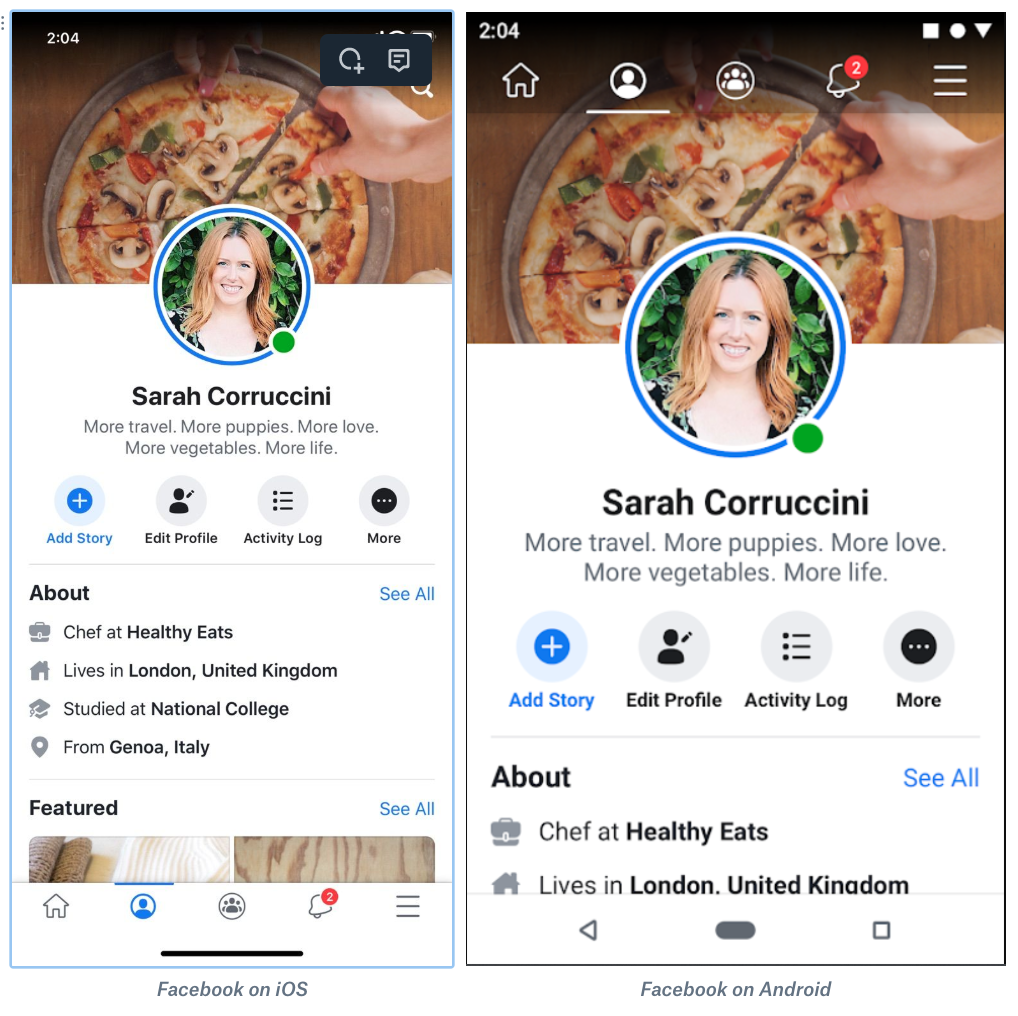 Overall, the elements included in app and web pages are remarkably similar. This is no accident. People find familiar interfaces intuitive. It's really easy to learn how to use the next social networking platform when it looks and feels a lot like Facebook.