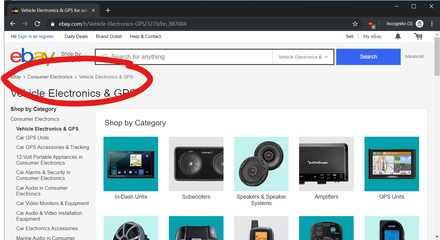 When you go through an app, it's easy to lose your place. Breadcrumbs are a handy trick to keep track of where you are. A breadcrumb is a list of where you are in a hierarchy, and you can click on any of those list items to go up or down that hierarchy. This is common on e-commerce websites to help you keep track of where you are, like on eBay below: