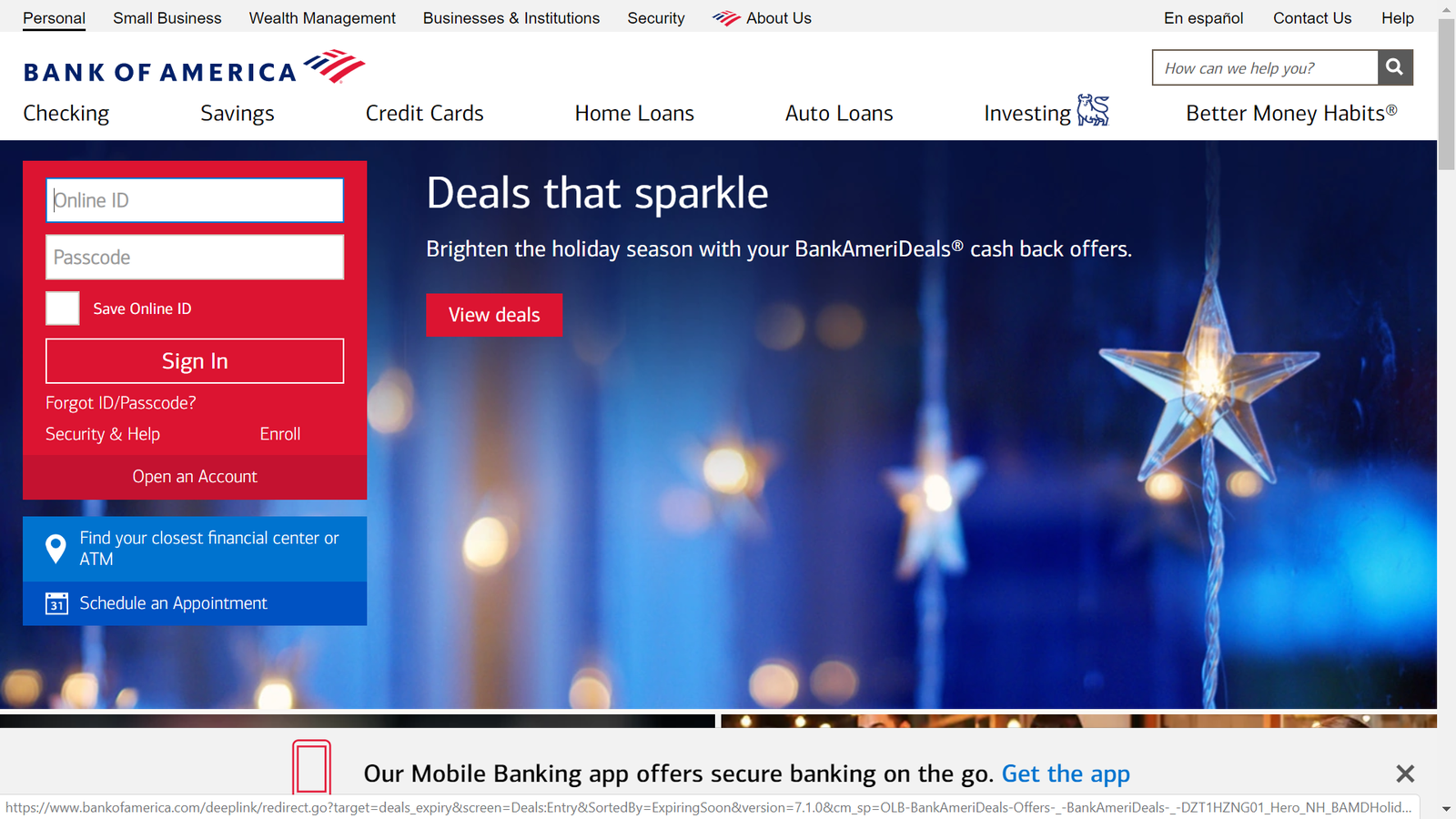 Bank of America's website, on the other hand, allows users to log in (arguably the most important reason someone would navigate to their site) and takes the opportunity to market additional services: