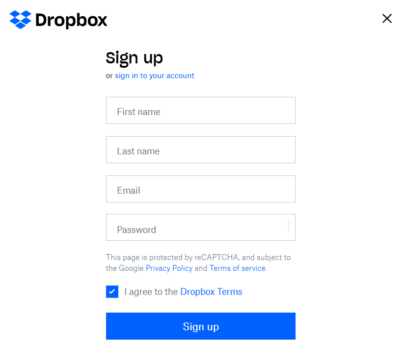 The Dropbox sign-up form uses text fields and a single checkbox to confirm that users agree to the terms of service: