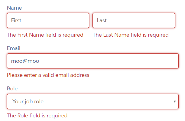 To reiterate, make sure error states are easy to spot and correct. Below are a few blank fields and a bad email address in the Salesforce developer sign-up form. It's pretty clear why those errors are showing up and what a user needs to do to fix it. The use of the color red helps emphasize the fields that need correcting: