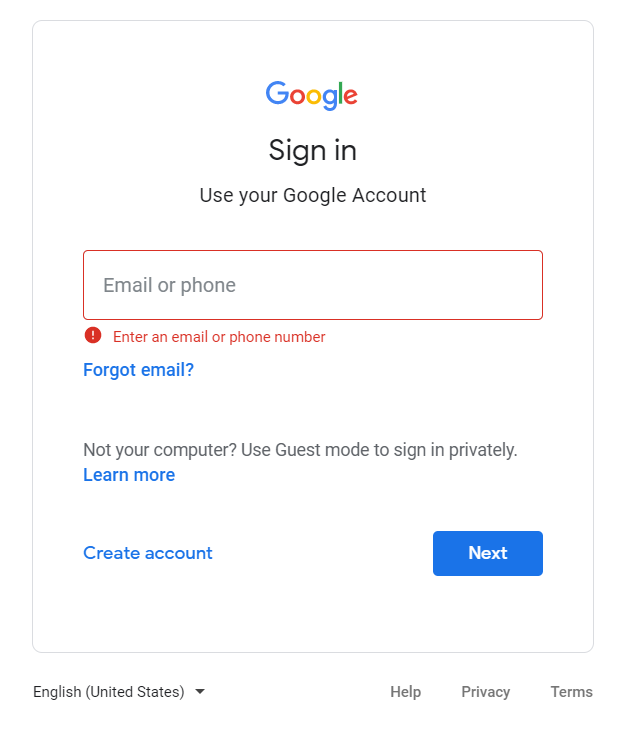 Note how Google's sign-in form (above) clearly indicates what the error is and how to fix it, using red frames, red text, and a warning symbol.