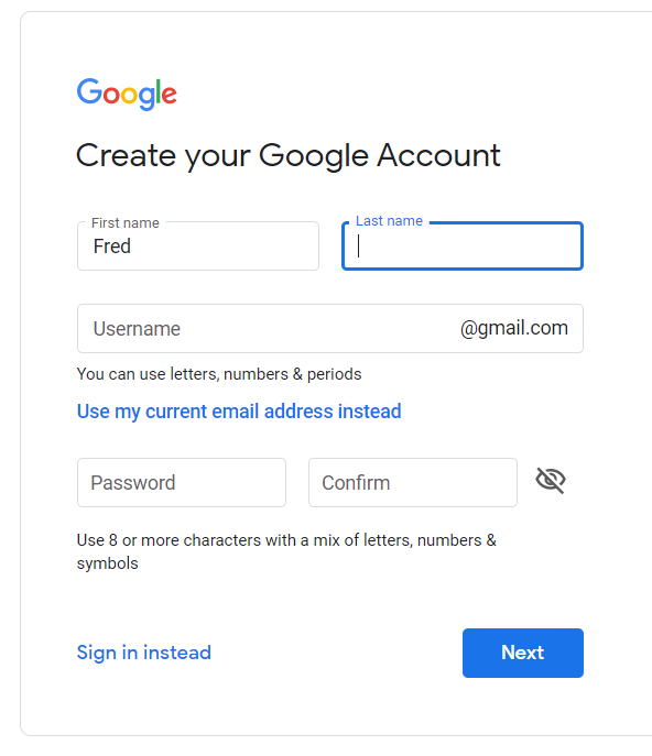 Place labels in a consistent position for all fields. If you want to place the label inside the field, make sure that you move it to an appropriate place if it has focus or is filled in. See the Google sign-up form below as an example. Blank fields have the label in the input box. When filled in or focused, the labels are on top of the field: