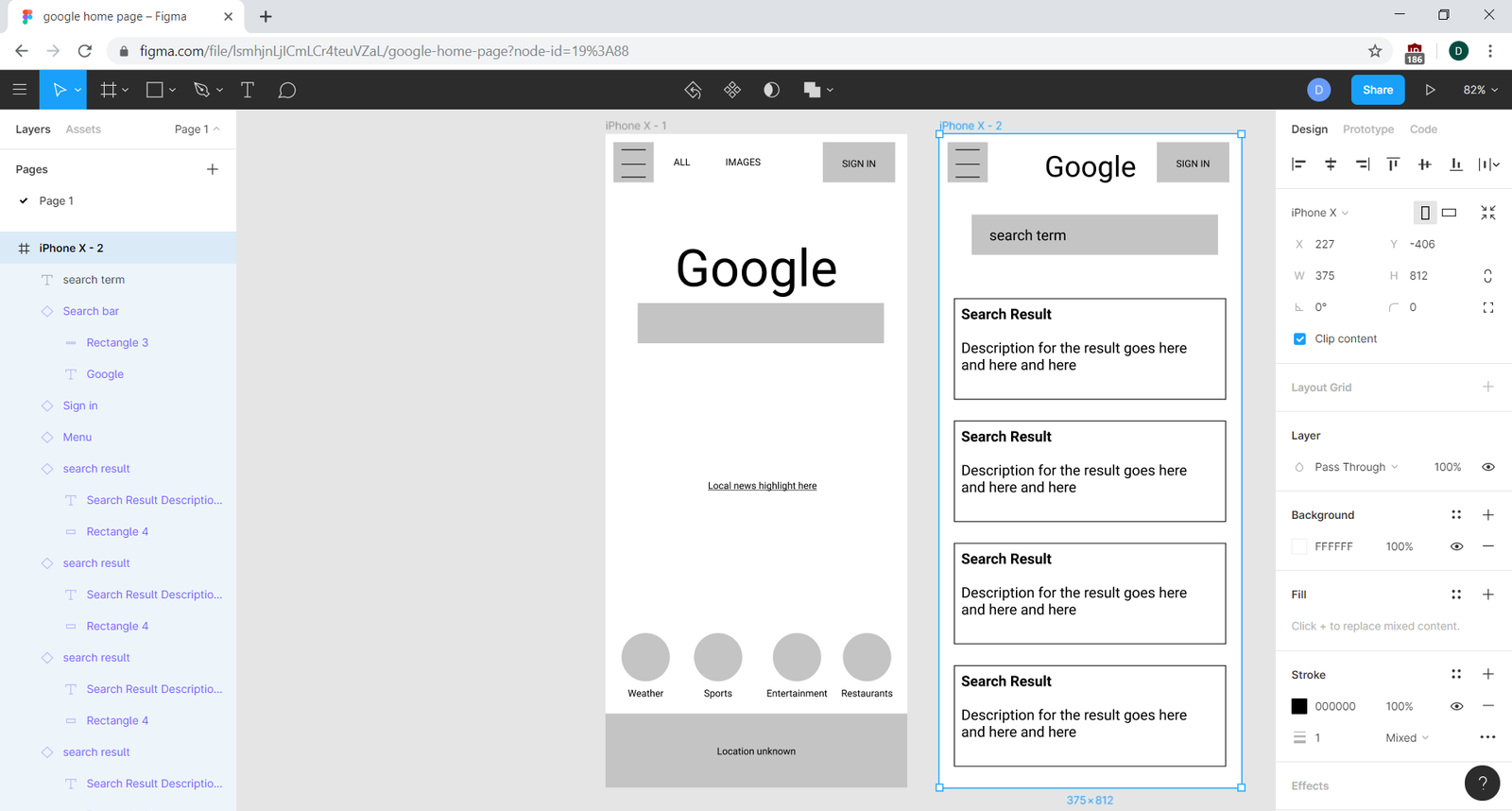 First, add a new frame—hit F and choose the iPhone X design on the right panel. Fill in that frame with a second page—in this case, the search results page.