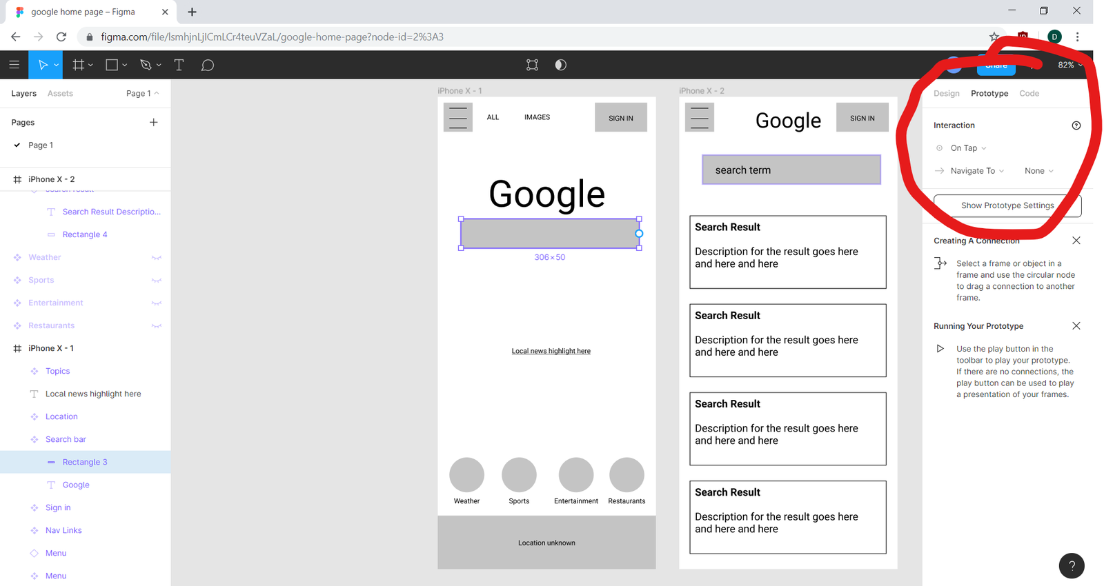 Finally, hit the play button in the upper right corner. This will start up a prototype using your settings. If you click anywhere in the background, you'll see the search bar highlight briefly. That's your indication that it's a clickable element. Click it and it will take you to page two.