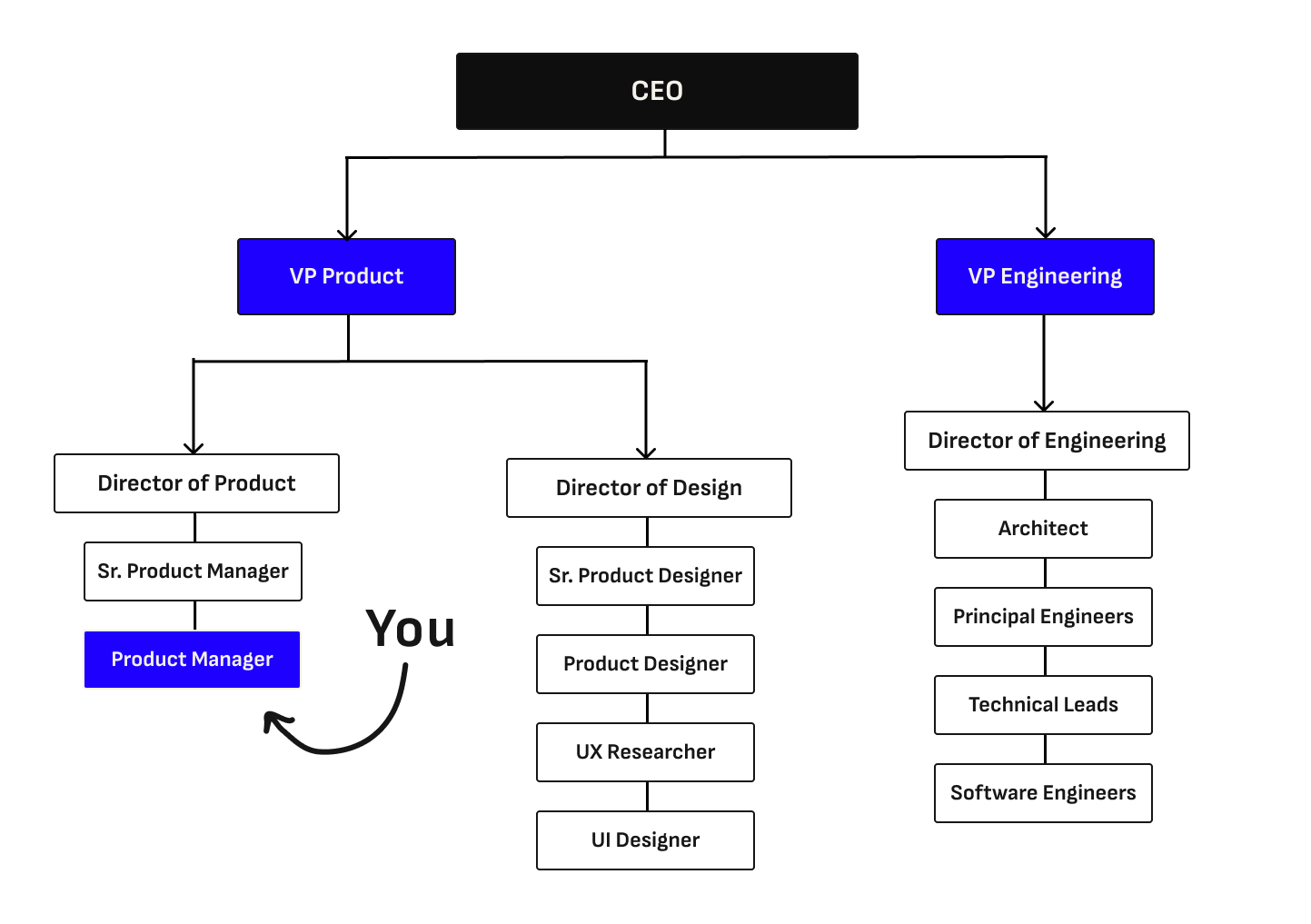 Your product team will include you and the other product managers responsible for running your products. The team is usually led by a VP of product, or CPO, but it's not unusual to report to a chief technical officer (CTO), a startup co-founder, or a head of product. At a large company, you may report to a director of product, who in turn reports to a VP or CPO; this helps your manager do a more effective job of overseeing your work.