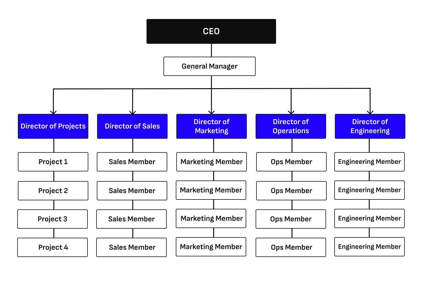 A matrix organization is one that doesn't have fixed teams. Instead, teams are created based on the demands of any individual project. Representatives of each function (project manager, sales, engineering, etc.) work together as a team focused on a specific project. (This is represented by rows in the diagram below.) Matrix organizations enjoy lots of flexibility and can assign the required number of people based on project needs to maximize their use of resources. However, it can be confusing for employees because it's not always clear who's responsible for making decisions or who you can contact for help on specific issues.