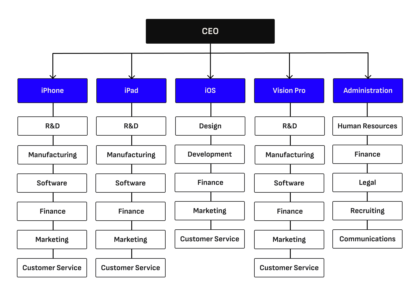 Another way to organize a company is to divide teams by product and have people from all functions in each product team. In a way, each team functions like a micro-company within a larger business. For example, Apple has a group responsible for creating and selling their phones and a separate team in charge of their applications. Those groups look similar in terms of the functions of the people in them.