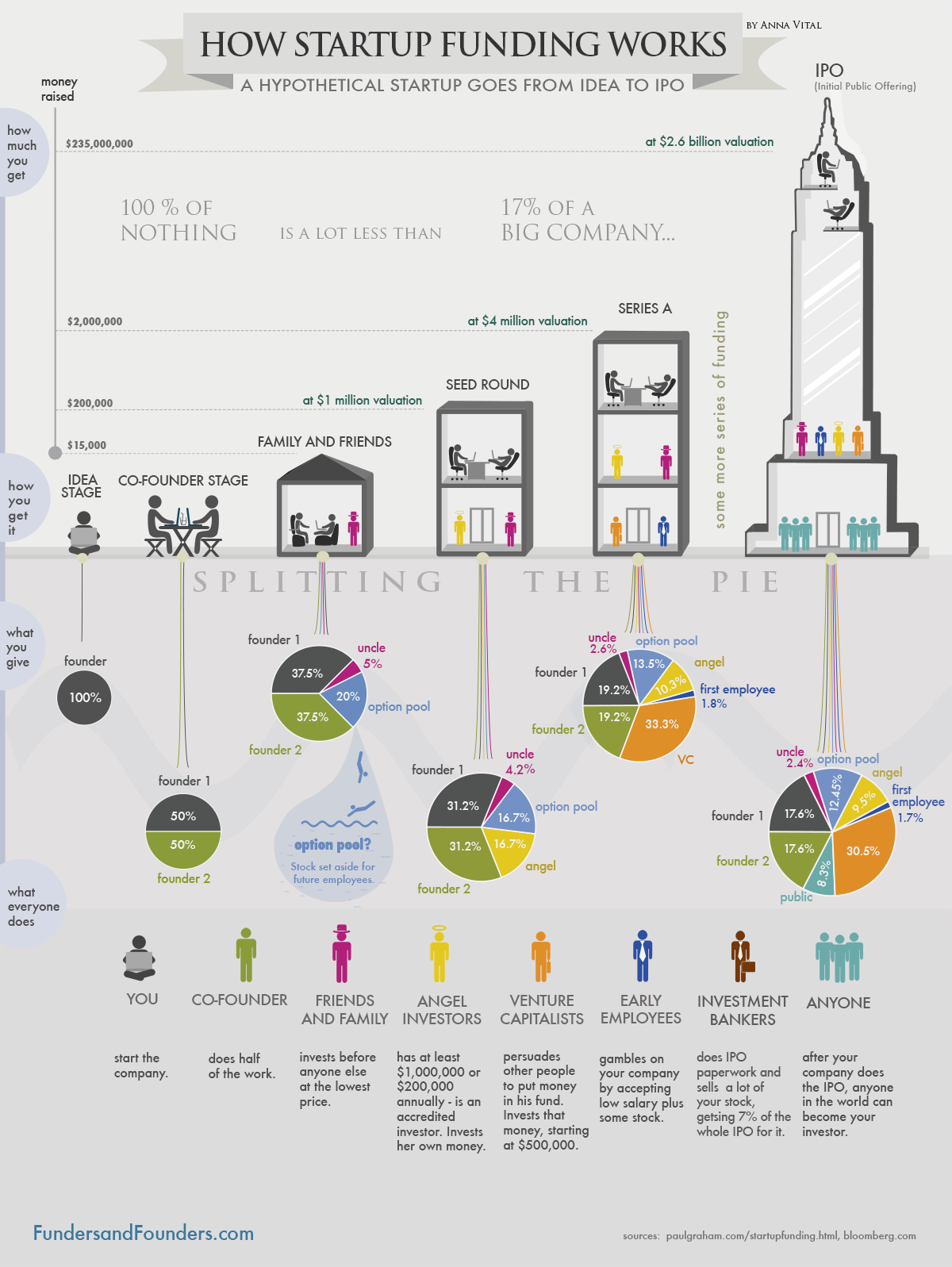 The below chart gives a detailed explanation on how startups grow and how they are funded. Note, that not all startups require funding, some are bootstrapped too